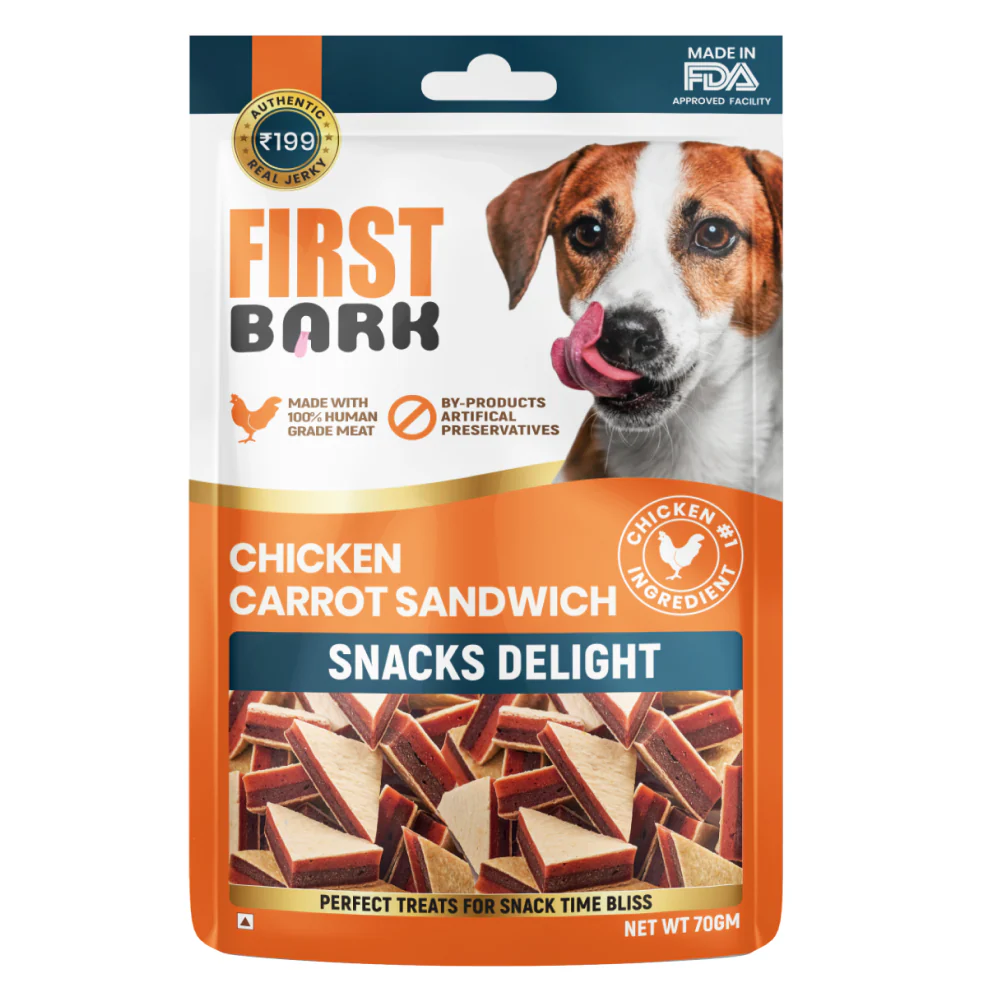 First Bark Jerky Chicken Carrot Sandwich is a delicious and wholesome treat crafted for dogs who enjoy soft, flavourful snacks. Made with real chicken and natural carrot, it offers a perfect balance of protein and fiber to support digestion and overall health. Its tender, sandwich-style texture makes it easy to chew, even for small or senior dogs. Ideal for training, rewarding, or daily snacking, this treat is tasty, nutritious, and completely safe for your pet.