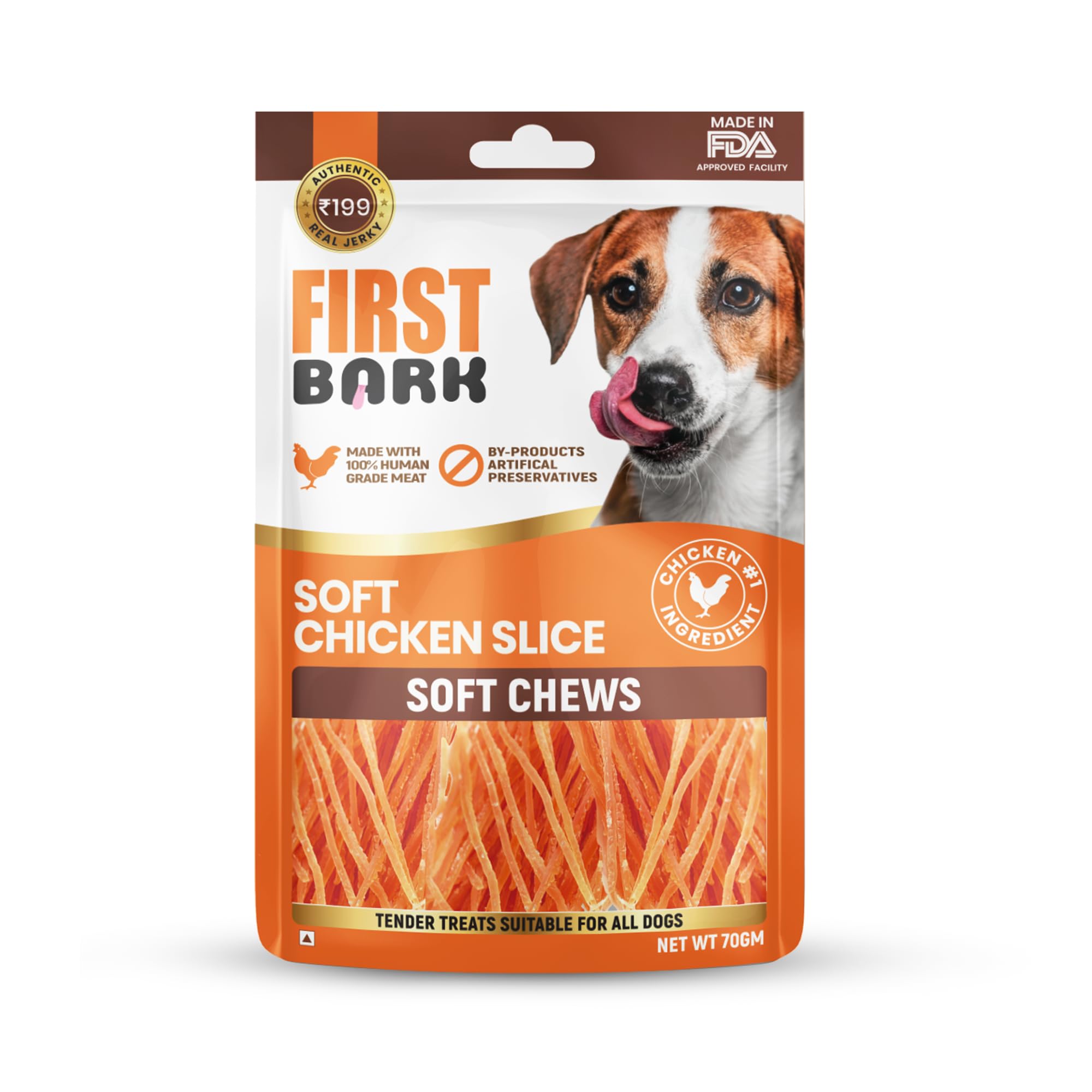 First Bark Jerky Soft Chicken Slice is a premium, protein-rich dog treat made from high-quality chicken. Its soft, easy-to-chew texture makes it ideal for dogs of all ages, including puppies and seniors. Packed with essential nutrients, it supports healthy muscles, strong immunity, and overall vitality. Perfect as a training reward or everyday snack, these slices are free from artificial colors, flavors, and preservatives, offering a wholesome, tasty, and guilt-free treat for your furry companion.
