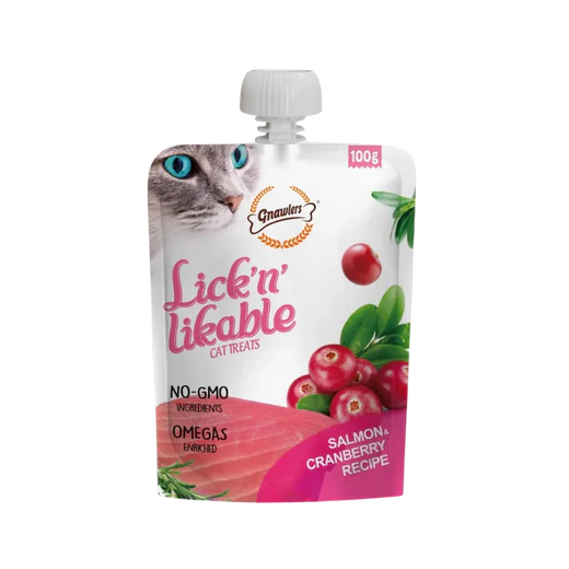 Gnawlers Lick n Likable Treats Salmon & Cranberry Recipe is a delightful, nutritious snack for your cat. Made with real salmon and wholesome cranberries, these treats are packed with essential proteins, vitamins, and antioxidants to support overall health and vitality. The soft, lickable texture makes them irresistible, perfect for bonding or rewarding your feline friend. Free from artificial additives, they provide a tasty, healthy indulgence your cat will love every time.