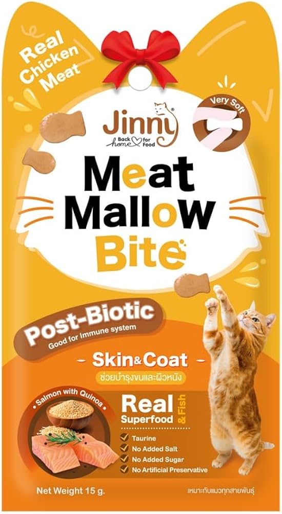 Meat Mallow Bite Skin & Coat is a specially formulated treat that promotes healthy, shiny fur and nourished skin in cats. Enriched with essential fatty acids, vitamins, and proteins, it supports coat softness, reduces shedding, and enhances overall skin health. Delicious and highly palatable, these bites make grooming easier while providing a tasty reward. Perfect for maintaining your cat’s vibrant coat and keeping them happy and healthy every day.